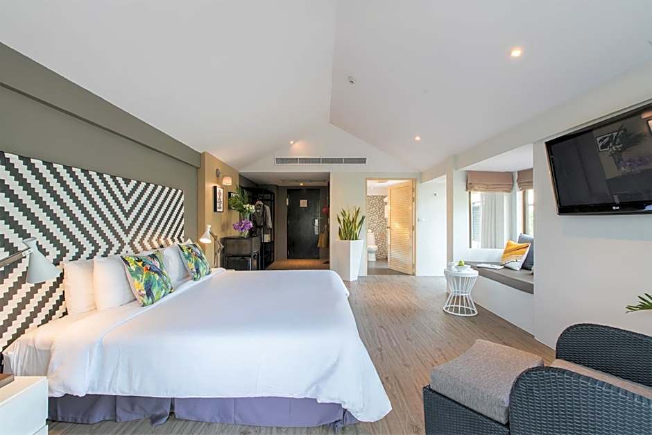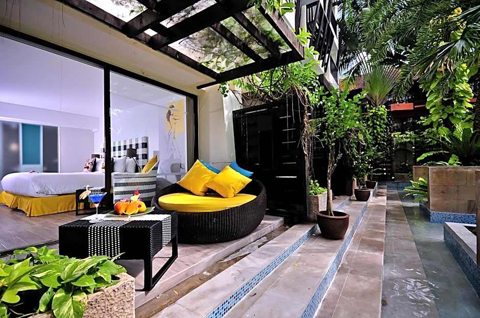 Decorated with cheerful textiles and local artwork, spacious room featuring a balcony with direct pool access. Guests can relax at indoor and outdoor lounging areas. Slippers and toiletries are available.